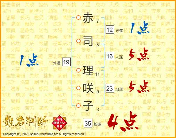 赤(7画)司(5画) 理(11画)咲(9画)子(3画)