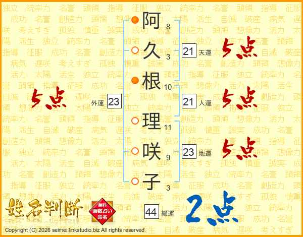 阿(8画)久(3画)根(10画) 理(11画)咲(9画)子(3画)