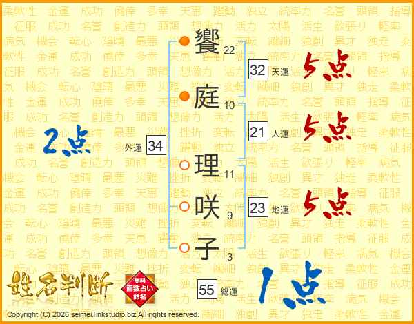 饗(22画)庭(10画) 理(11画)咲(9画)子(3画)