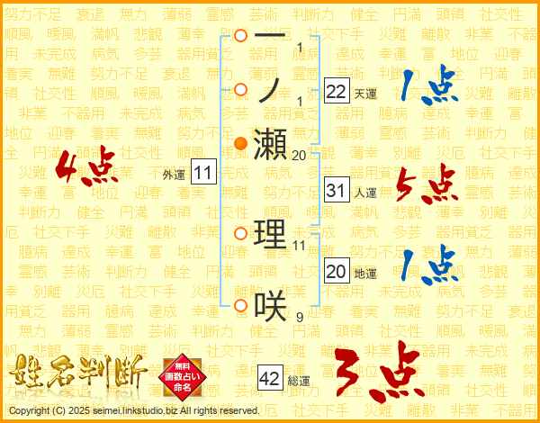 一(1画)ノ(1画)瀬(20画) 理(11画)咲(9画)