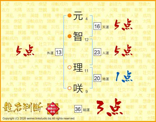 元智理咲さんの総運は36画の3点!
