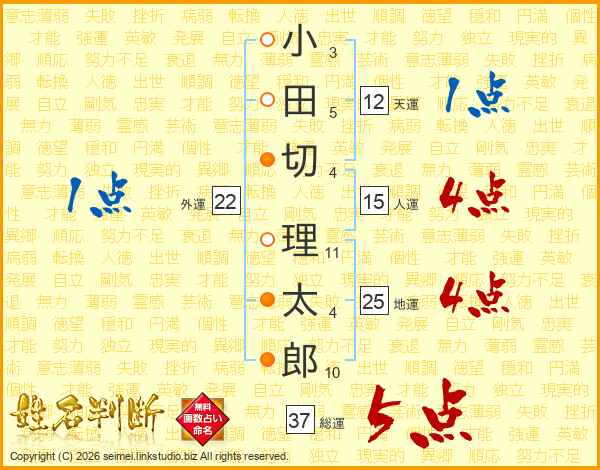 小(3画)田(5画)切(4画) 理(11画)太(4画)郎(10画)