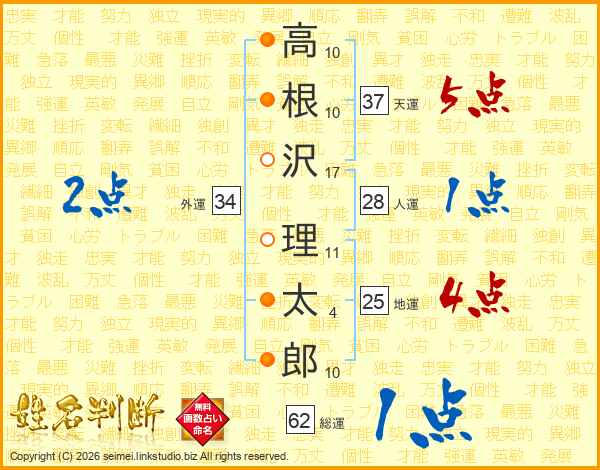高(10画)根(10画)沢(17画) 理(11画)太(4画)郎(10画)