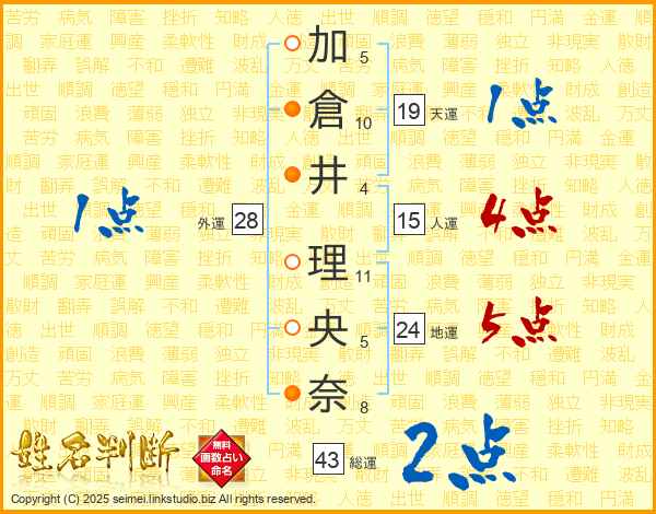 加(5画)倉(10画)井(4画) 理(11画)央(5画)奈(8画)