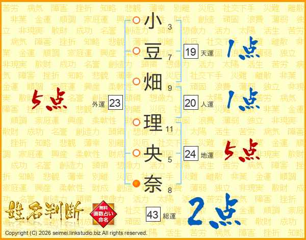 小(3画)豆(7画)畑(9画) 理(11画)央(5画)奈(8画)