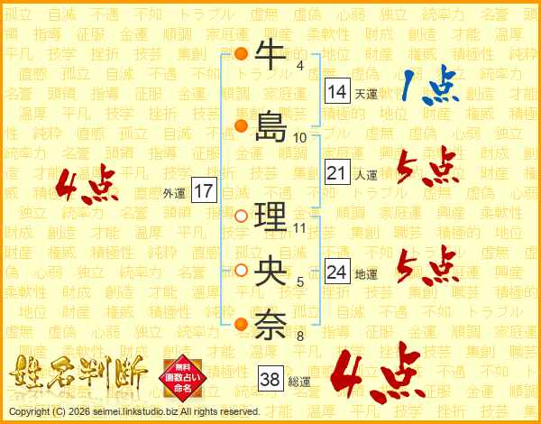 牛(4画)島(10画) 理(11画)央(5画)奈(8画)
