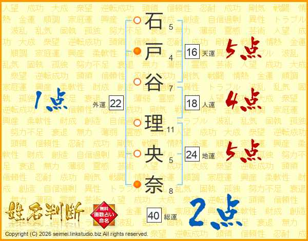 石(5画)戸(4画)谷(7画) 理(11画)央(5画)奈(8画)