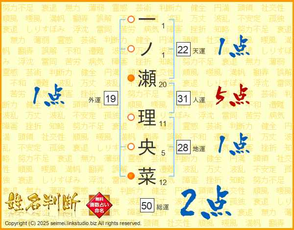一(1画)ノ(1画)瀬(20画) 理(11画)央(5画)菜(12画)
