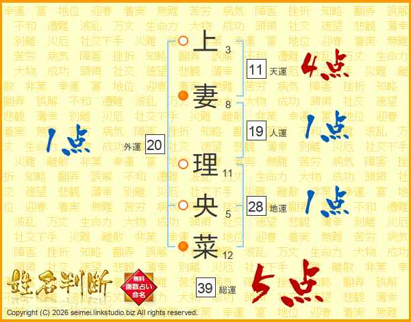 上妻理央菜さんの総運は39画の5点!