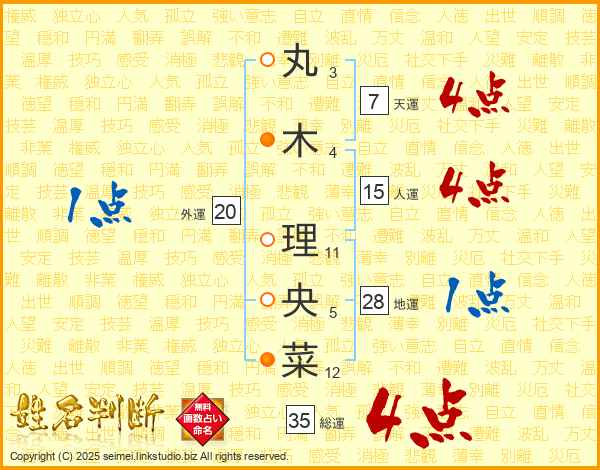 丸(3画)木(4画) 理(11画)央(5画)菜(12画)