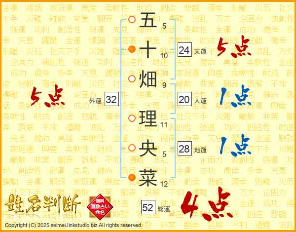 生活面を象徴する運勢です。外部から受ける影響力を表し、結婚運、家庭運や職場、環境への順応性を表します。総運から人運を引いた画数。姓や名が1文字の場合を除く。