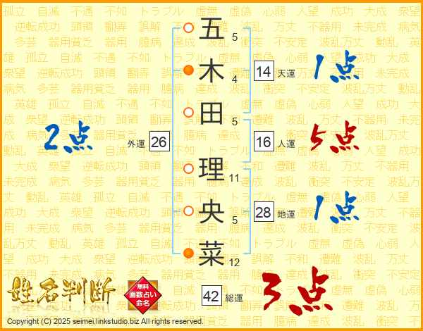 五(5画)木(4画)田(5画) 理(11画)央(5画)菜(12画)