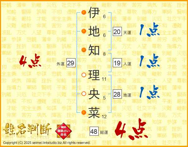伊(6画)地(6画)知(8画) 理(11画)央(5画)菜(12画)