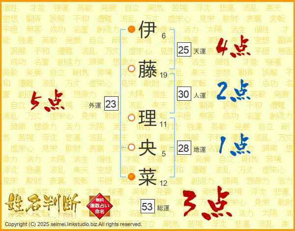 伊(6画)藤(19画) 理(11画)央(5画)菜(12画)
