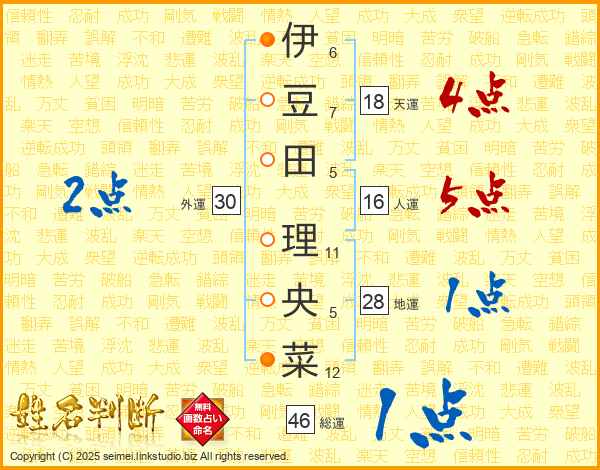 伊(6画)豆(7画)田(5画) 理(11画)央(5画)菜(12画)