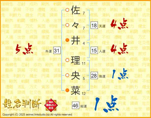 佐(7画)々(7画)井(4画) 理(11画)央(5画)菜(12画)