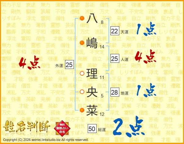 八(8画)嶋(14画) 理(11画)央(5画)菜(12画)