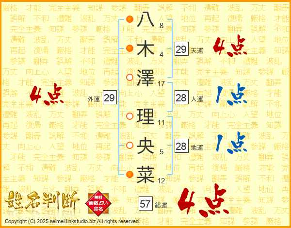 八(8画)木(4画)澤(17画) 理(11画)央(5画)菜(12画)
