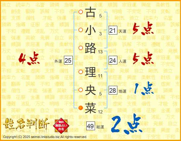 あなたの人生を表す1番重要な運勢です。生涯を通じて影響する総合運となり、主に50歳以降の晩年期に影響を及ぼします。苗字と名前の合計画数。
