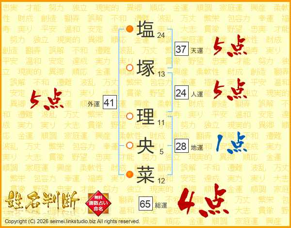 塩(24画)塚(13画) 理(11画)央(5画)菜(12画)