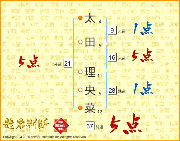 太(4画)田(5画) 理(11画)央(5画)菜(12画)