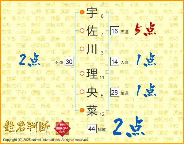 宇(6画)佐(7画)川(3画) 理(11画)央(5画)菜(12画)