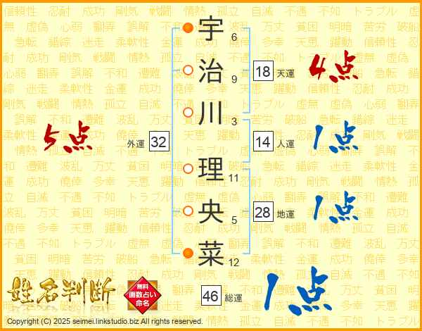 宇(6画)治(9画)川(3画) 理(11画)央(5画)菜(12画)