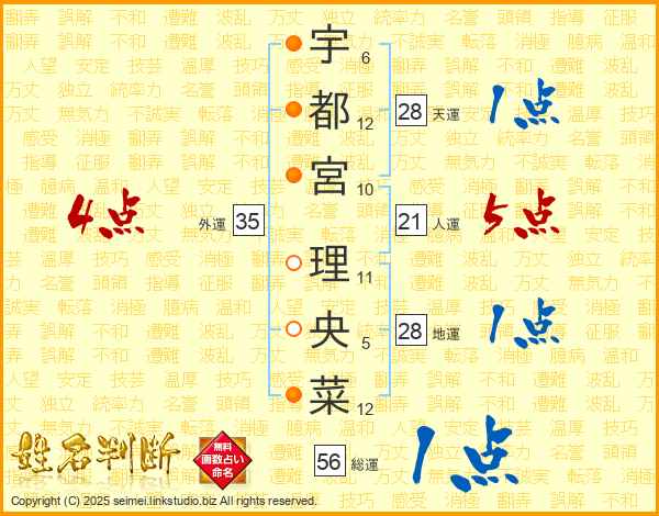 宇(6画)都(12画)宮(10画) 理(11画)央(5画)菜(12画)