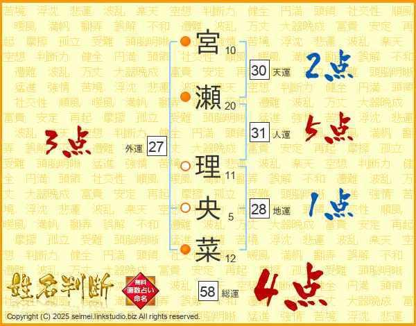 宮(10画)瀬(20画) 理(11画)央(5画)菜(12画)