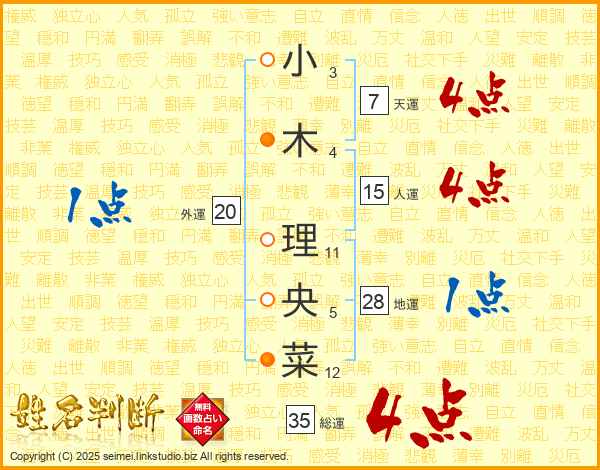 小(3画)木(4画) 理(11画)央(5画)菜(12画)