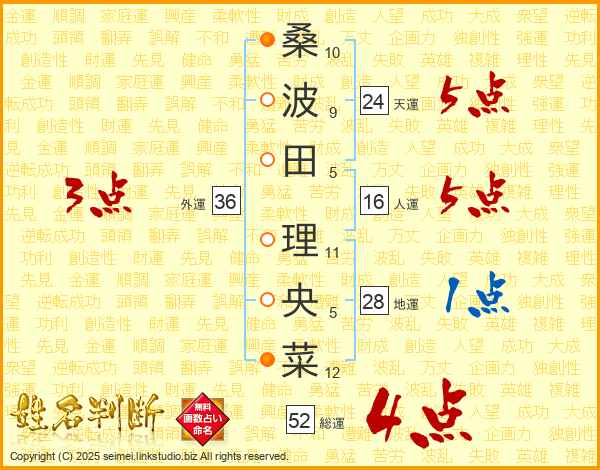 桑(10画)波(9画)田(5画) 理(11画)央(5画)菜(12画)