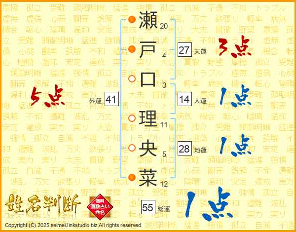 瀬(20画)戸(4画)口(3画) 理(11画)央(5画)菜(12画)