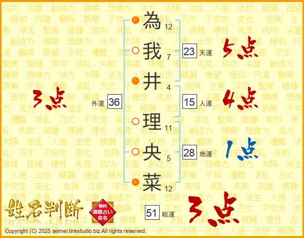為(12画)我(7画)井(4画) 理(11画)央(5画)菜(12画)