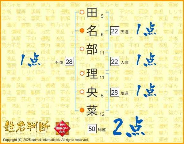 田(5画)名(6画)部(11画) 理(11画)央(5画)菜(12画)