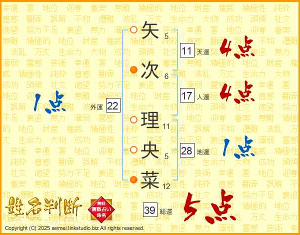 矢(5画)次(6画) 理(11画)央(5画)菜(12画)