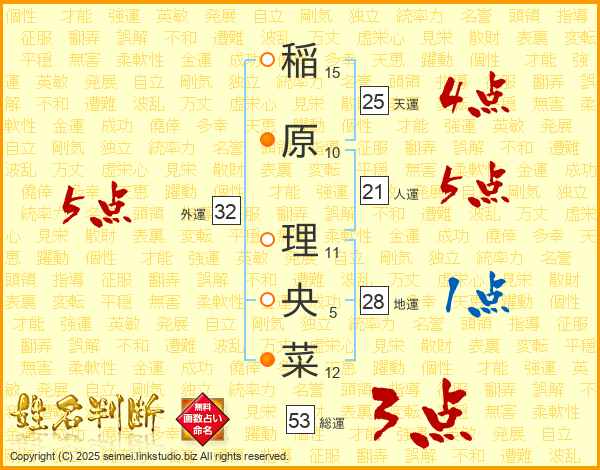 稲(15画)原(10画) 理(11画)央(5画)菜(12画)