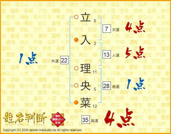 立(5画)入(2画) 理(11画)央(5画)菜(12画)