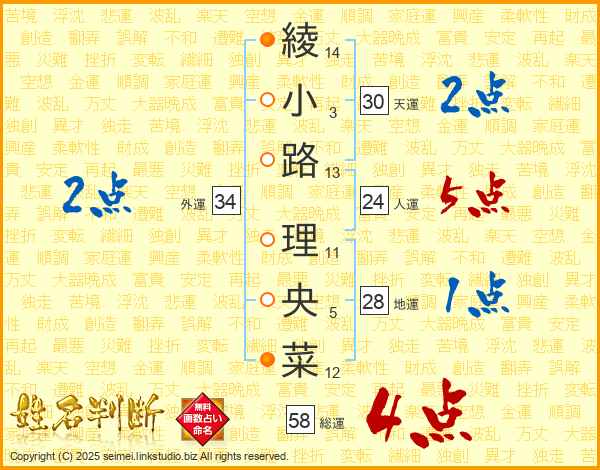 綾小路理央菜さんの総運は58画の4点!