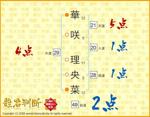華(12画)咲(9画) 理(11画)央(5画)菜(12画)
