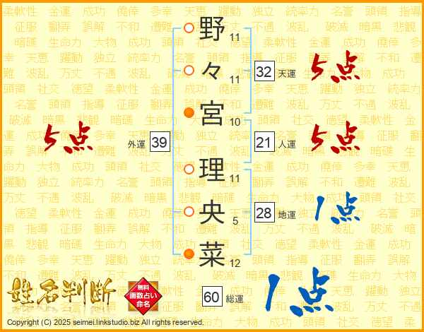 生活面を象徴する運勢です。外部から受ける影響力を表し、結婚運、家庭運や職場、環境への順応性を表します。総運から人運を引いた画数。姓や名が1文字の場合を除く。