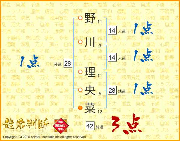 野(11画)川(3画) 理(11画)央(5画)菜(12画)