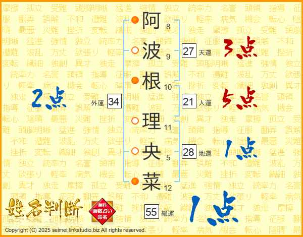 生活面を象徴する運勢です。外部から受ける影響力を表し、結婚運、家庭運や職場、環境への順応性を表します。総運から人運を引いた画数。姓や名が1文字の場合を除く。