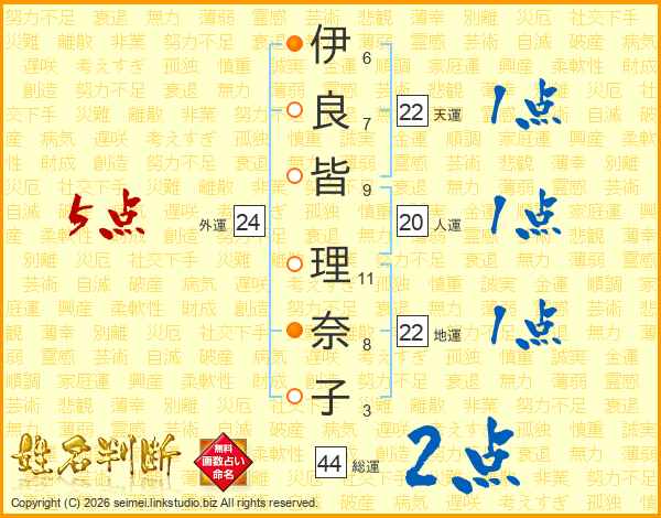 伊(6画)良(7画)皆(9画) 理(11画)奈(8画)子(3画)