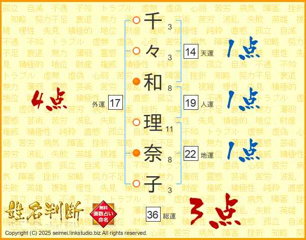 千(3画)々(3画)和(8画) 理(11画)奈(8画)子(3画)