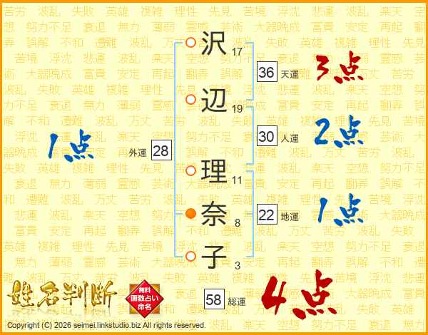 沢(17画)辺(19画) 理(11画)奈(8画)子(3画)