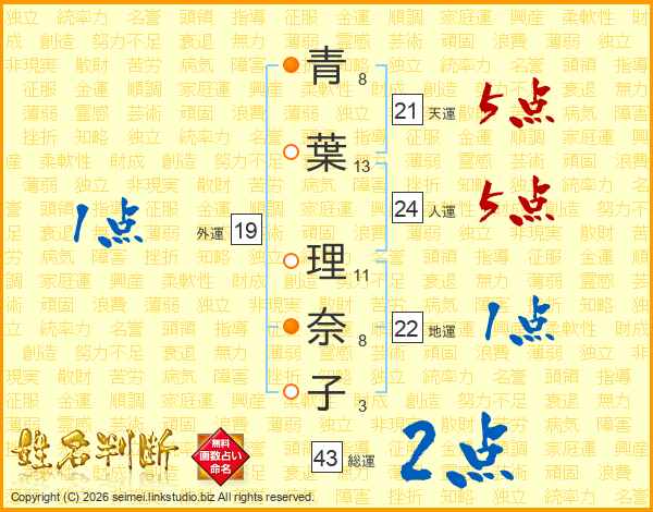 青(8画)葉(13画) 理(11画)奈(8画)子(3画)