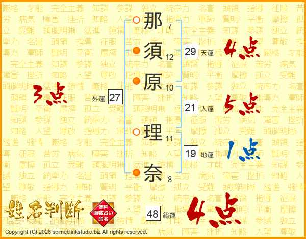 那(7画)須(12画)原(10画) 理(11画)奈(8画)