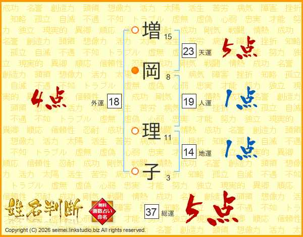 生活面を象徴する運勢です。外部から受ける影響力を表し、結婚運、家庭運や職場、環境への順応性を表します。総運から人運を引いた画数。姓や名が1文字の場合を除く。