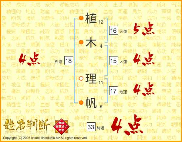 生活面を象徴する運勢です。外部から受ける影響力を表し、結婚運、家庭運や職場、環境への順応性を表します。総運から人運を引いた画数。姓や名が1文字の場合を除く。