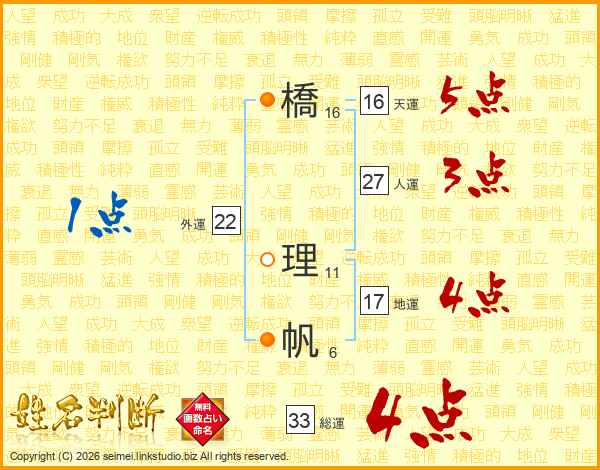 橋理帆さんの総運は33画の4点!